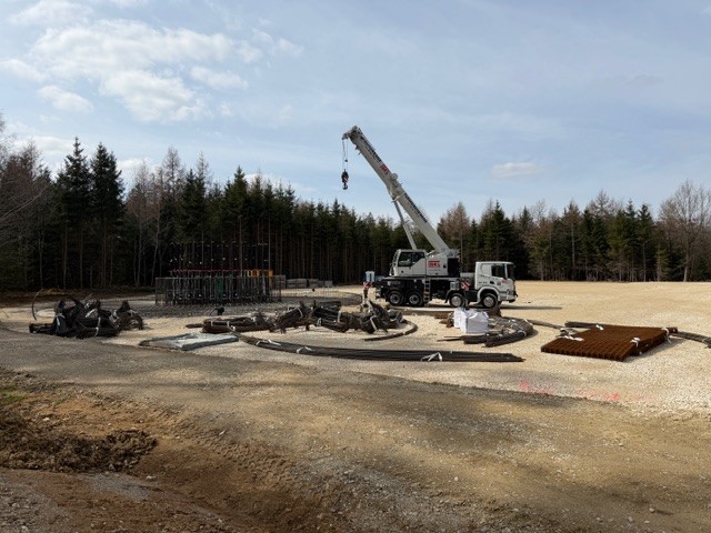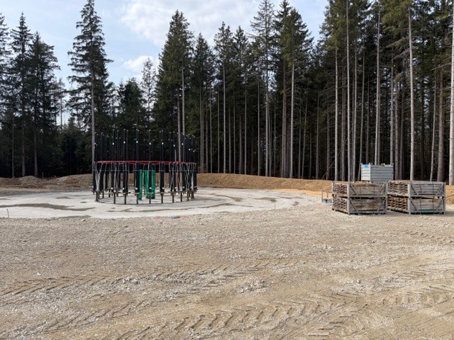 • An der Windkraftanlage WEA3 haben die Armierungsarbeiten begonnen. Kranstellflächen sind eingerichtet und der Ring für die Spannseile für den Turm ist aufgestellt